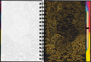 • The right-hand, black-coated pages feature intricate art for tracing to reveal brilliant golds, silvers, greens, or rainbow glitter beneath.