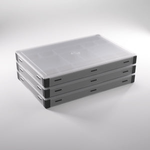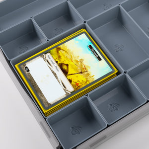 The Token Silo XL stores and organizes a vast variety of tokens, tools, cards, dice, and many other items. There are 15 trays in 5 different sizes, including 2 Mini-American trays, 2 Standard Card trays, as well as 1 extra-long tray. All trays are fully removable and can be swapped with trays from the original Gamegenic Token Silo and Token Silo Cards Add-on, granting maximum flexibility and additional customization. The cover of the Token Silo XL clips to the bottom for easy access and more space on the gaming table.
