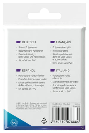 Rigid polypropylene card dividers with index tabs to organize your card collection. They fit fully in all standard-sized Ultimate Guard card cases and boxes.