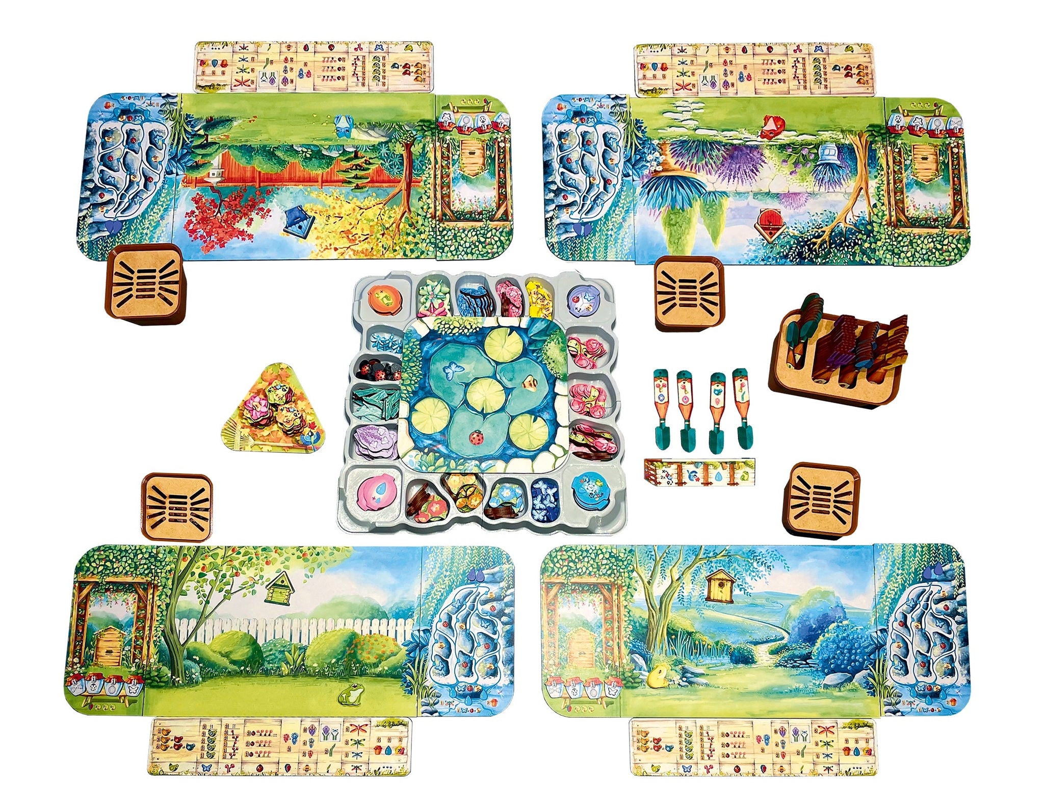 In Pergola, players develop their gardens, grow new plants, and attract insects and small animals. On their turn, a player chooses one of the four available tools, picks the presented items, and arranges them in their garden. Then they perform the action corresponding to the chosen tool. Since players have a lot of freedom in arranging plants in their gardens, after fifteen rounds each garden looks completely different and scores differently. The player who accumulates the most points wins.
