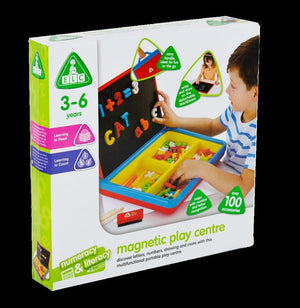 Over 100 accessories included. Discover letters, numbers, drawing and more with this multifunctional portable play centre. Helps with number and letter recognition. Carry handle ideal for fun on the go. Write and draw on the detachable background. develop language and communication skills. make simple sums using the numbers and symbols. paper chalk and eraser included. Inclides: 40 magnetic upper case letters, 40 magnetic lowercase letters, 10 magnetic numbers, 7 symbols, 3 chalks, 1 eraser, 20 sheets of paper, 1 detachable blackboard, 1 carry case. Magnetic maths and sticky spellings: lets use the magnetic letters and numbers to count, spell and make fun sentances. We can use numbers and symbols to make easy sums and make lots of words with the letters. Use the chalk to draw on teh board. Wipe off when you finish and start again. You can also place the paper included onto the blackboard to make a portable draeing board perfect for on the go