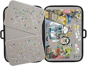 The De-Luxe Portapuzzle has a wipe clean leather-look external finish, a zip around to close it up securely, and a sturdy carry handle. The special lining keeps the pieces in place and provides a rigid surface on which to work. Included are two lift out panels to place loose pieces or sections of the Jigsaw on. Designed to support most 1000 piece jigsaw puzzles. Carrier Dimensions: 81.2cm x 55.8cm (32in x 22in)