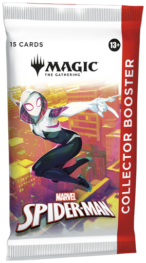 Collector Boosters gather all the coolest cards and foil treatments in one place! Each booster contains Rares and/or Mythics, Traditional Foils, a Borderless basic land, and more. Web-slinging heroes may encounter even more beautiful foils and picture-perfect lands. You could also find the headliner card—the most collectible pull of all!