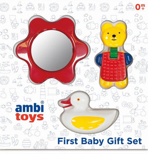 A collection of three toys for a new baby. Each toy offers a different activity: Ted Triple Teether encourages a young baby to rattle, suck, chew and touch; Bath Duck is ideal for bath time fun; and with the Baby Mirror, a baby discovers their reflection and begins to learn about who they are.