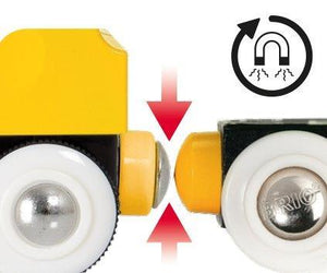 Just press the arrow button on the top and the train is on its way. Press again and the train stops. The clever connection magnets will connect with wagons in every direction, so here we go.