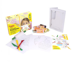 Each kit contains: reusable storage folder, 8 PASTEL colors PLASTILINA 50 gr bars, 3 pre designed templates, 2 free use templates, 1 white paper frame, 3 modelling tools, 1 roller, 1 instructions sheet.