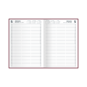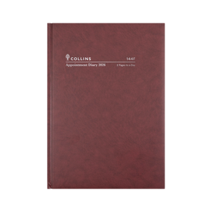The Collins Appointment diary is bound in deep burgundy, with sections sewn for extra strength, the page layouts include week counts, Julian day counts and national and international holidays, as well as times printed clearly down each page.