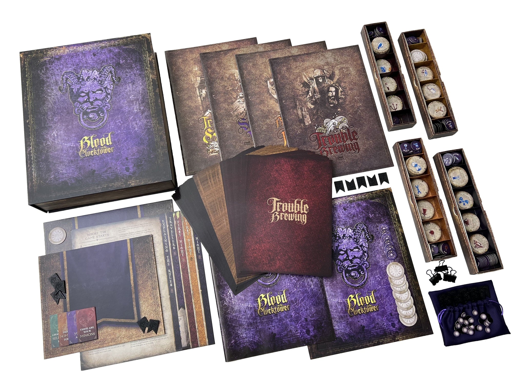 During a hellish thunderstorm, on the stroke of midnight, there echoes a bone-chilling scream. The townsfolk rush to investigate and find the town storyteller murdered, their body impaled on the hands of the clocktower, blood dripping onto the cobblestones below. A Demon is on the loose, murdering by night and disguised in human form by day. Some have scraps of information. Others have abilities that fight the evil or protect the innocent. But the Demon and its evil minions are spreading lies to confuse and breed suspicion. Will the good townsfolk put the puzzle together in time to execute the true demon and save themselves? Or will evil overrun this once peaceful village?