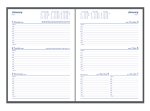 Bound in a rigid leather-look PVC cover, the Associate range features recycled paper, a satin marker ribbon and a distinctive page layout, with each dated spread containing a 12 month to view calendar, week numbers and Julian days, as well as both national and international public holidays.