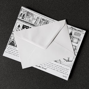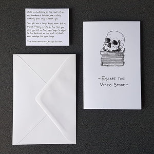Puzzle cards are an escape room-type experience in a greeting card. The scene illustrated within the card presents you with a series of written, visual, and abstract clues. These clues will need to be found and pieced together to solve the puzzle and “escape the video store”. The solution to the puzzle is a codeword.