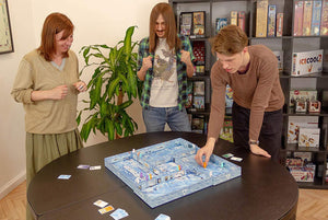 The lunch break is almost there and all of the young penguins would finally get the fish they’ve been craving. However, some rascals think they are quick enough to snatch some of the fish before the lunch break starts, but they have forgotten one thing – the Hall Monitor! Each school day one of the penguins is designated to watch over the school, and this is his moment to shine – for each rascal penguin he catches he would get additional fish! A fun run takes place – the rascals are running everywhere and trying to snatch some fish on their way, but the Hall Monitor is trying to catch each and one of them to have some order in the school. Who will be more successful? ICECOOL is a flicking game in which each round one of the players takes the role of the Hall Monitor (also called "the Catcher") – his aim will be to catch each other penguin and get points for that. The others (also known as "Runners") will try to run through several doors, thus gaining fish (that give them points) on their way. When either the Hall Monitor has caught each other penguin once or any of the others has gone through all 3 doors that have fish on them, the round is over. Each player will take the role of the Hall Monitor once and at the end of the game the winner will be the one with the most points on their fish cards. The penguins can be flicked in a straight line, make curves and even jump over the walls! Each player will have to use the best of their skills in order to get the most points in this fun and exciting game. Its not just cool, its ICECOOL! ICECOOL2 is both a standalone game and an expansion for ICECOOL. If played on its own, ICECOOL2 differs from the original game thanks to: