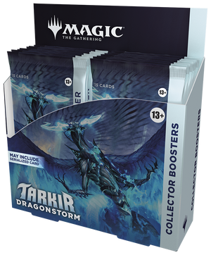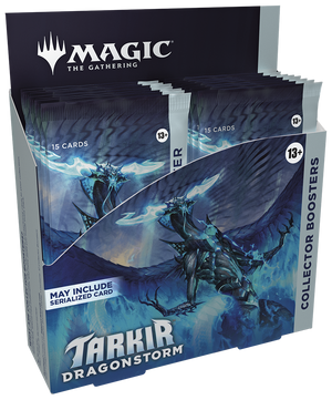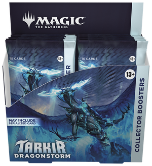 Bring home a trove of relics for your clan and triumph over the storm. Inthis box you’ll find 12 Tarkir: Dragonstorm Collector Boosters, each containing 15 Magic: The Gathering cards and 1 Traditional Foil double-sided token. Every pack includes 5 cards of rarity Rare or higher, 3–5 Uncommon, 4–6 Common, and 1 Full-Art Land cards, with a total of 9–11 Traditional Foil cards. Serialized card in <1% of Collector Boosters. Serialized cards are localized in English only but can be found in Tarkir: Dragonstorm Collector Boosters of any language. Non-serialized cards are mechanically identical to serialized variants.