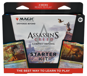 Infiltrate the world of Assassin’s Creed and begin your initiation into the Order. Gear up for your first games of Magic with two Assassin’s Creed-themed decks (featuring two Mythic Rare cards and eight Rare cards). Learn the ropes with the included booklet, then leap into action and claim victory! This Magic: The Gathering - Assassin’s Creed Starter Kit contains 2 ready-to-play 60-card decks (Lands included), 2 deck boxes to store them in, 1 Magic how-to-play guide booklet, and 2 double-sided reference cards (Turn Order/Attacking & Blocking).