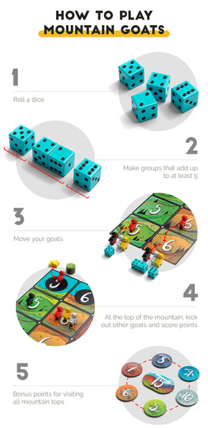In Mountain Goats you work to move your goats to the top of 6 different mountains where they can score points as long as they stay there.