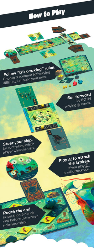 Strap on your eye patch and navigate your ship through turbulent waters in this cooperative trick-taking 2-player game! Reach the end of this dangerous deep end, and avoid taking damage from the Kraken to win the game together, or your crew will be sleeping with the fishes!
