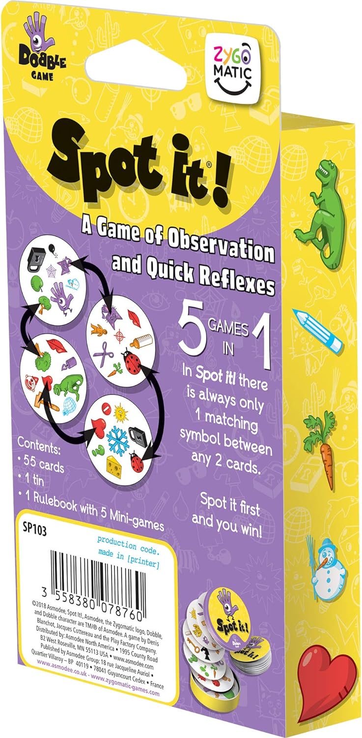 Test your observational skills and hone your reflexes with the award-winning gameplay of Spot It!, a game of lightning-fast choices for a group of two to eight players. With dozens of awards and possible versions married to elegant gameplay, Spot It! has become a global phenomenon. The game functions on a simple mechanic—fifty-five circular cards, each of which features a number of symbols and has exactly one of those symbols in common with every other card in the deck. With five distinct mini-games, you can be sure that Spot It! will be different every time you play, and because it’s always your turn, there’s never any downtime!
