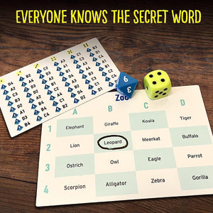 At the beginning of the round each player receives a card that tells them if they are the Chameleon or hunting the Chameleon. Two dice are rolled and this gives everyone (except the Chameleon) the coordinates to a specific word on a Topic Card – this is the Secret Word for the round. Each Topic Card features 16 related words (e.g. countries, books, food, etc.)